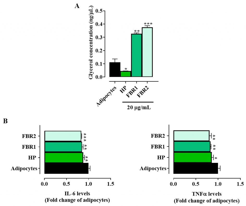 Figure 3. Effect of FBR1 and FBR2 extracts on lipolysis and cytokines in adipocytes. (A) Adipocytes were treated with HP Wt, FBR1 and FBR2 extracts. After 24 h in vitro lipolysis was assessed. (B) Adipocytes were treated with HP Wt, FBR1 and FBR2 extracts. Following 24 h, IL-6 and TNFα levels were evaluated and expressed as percentage of adipocytes (set at 1). Mean values ± SD of three replicate independent experiments with five replicates in each are shown. According to one-way ANOVA, differences were significant (*** p < 0.001, ** p < 0.01, * p < 0.05).